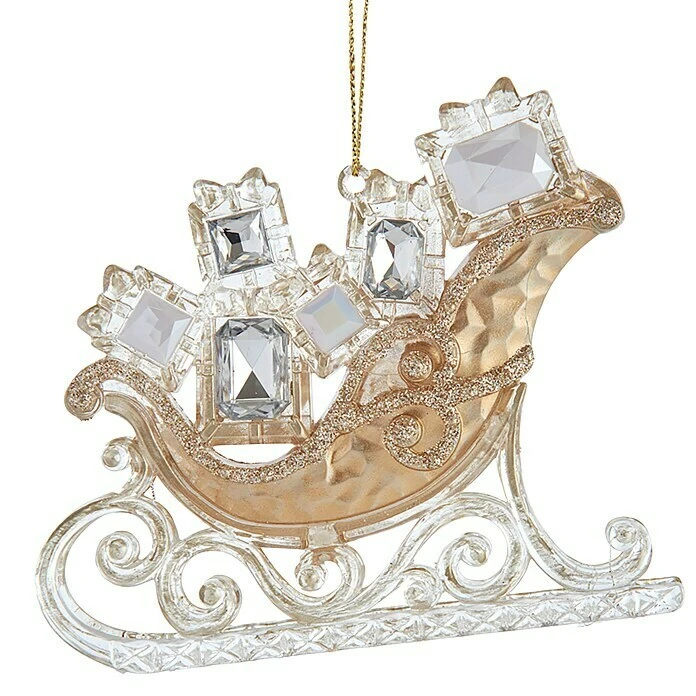 Der Christbaumschmuck in Form eines Schlittens ist die optimale Ergänzung zu jeder heimischen Weihnachtsdekoration. Der Schlitten verfügt über einen goldenen Schlitten mit passenden glitzernden Akzenten, gefüllt mit klaren Edelstein-Geschenken. Das fein ausgearbeitete Dekoelement erzeugt unmittelbar ein stimmungsvolles, weihnachtliches Ambiente.