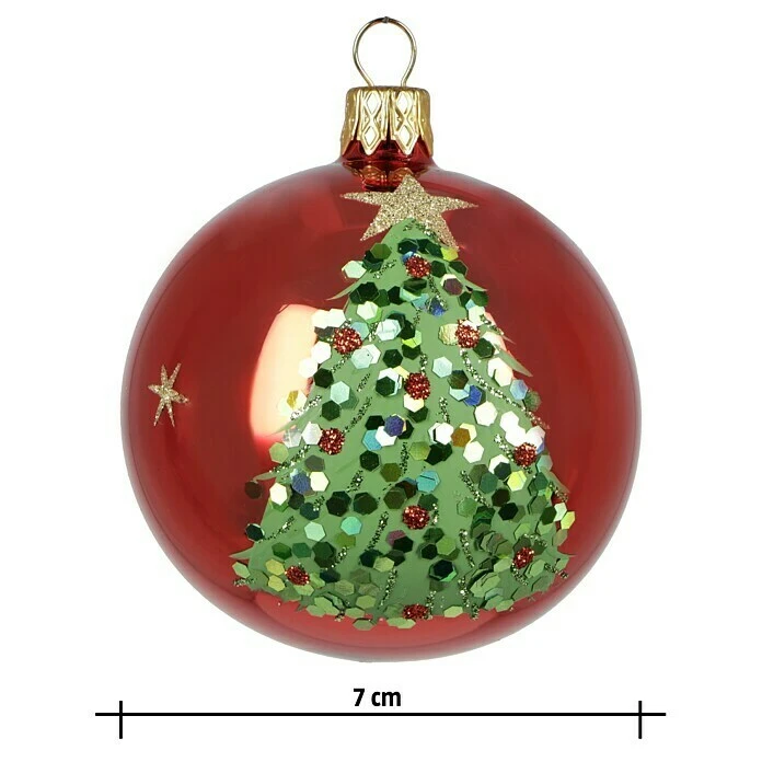 Der Christbaumschmuck in klassischer runder Form ist aus Glas gefertigt und nicht für große, sondern auch für kleine Weihnachtsbäume geeignet. Die Kugel hat einen Durchmesser von 7 cm ist handbemalt und mit einem Weihnachtsbaum verziert. Sie kann aufgrund der universellen Farbgebung vielseitig kombiniert werden.