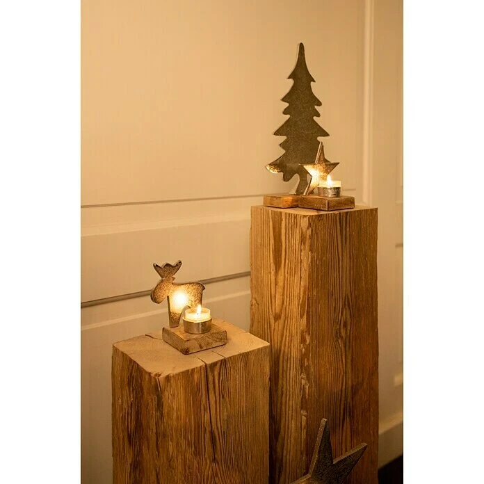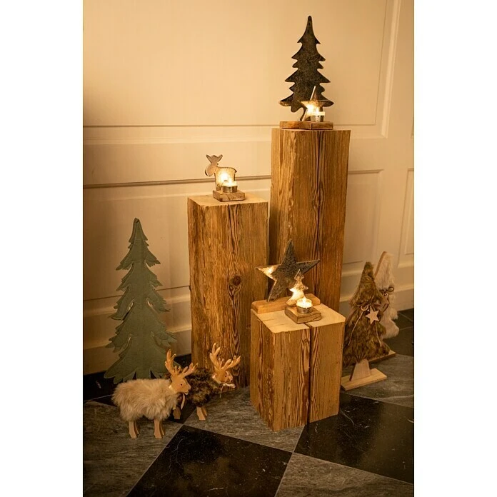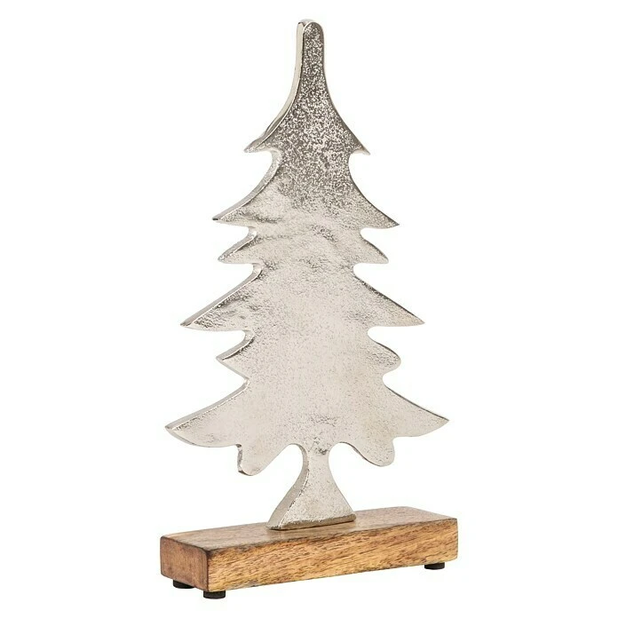Der Dekoartikel Baum ist aus Metall gefertigt und steht auf einem Holzsockel. Das Dekoelement hat eine Gesamthöhe von 30 cm. Der Baum verleiht Wohnräumen ein weihnachtliches Flair und passt sich durch seinen modernen und schlichten Stil jeder Einrichtung an.