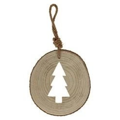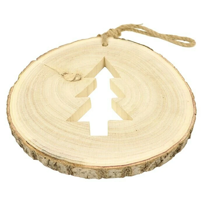 Die Baumscheibe mit Tannenausschnitt kann für vielerlei Dekorationen verwendet werden. Sie ist ca. 30 cm groß und besitzt eine Kordel zum Aufhängen. Da es sich um Naturmaterial handelt, sind Farb-, Größen- und Formabweichungen möglich.