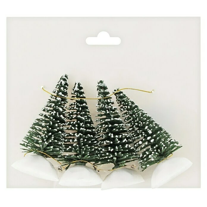 Die vier Tannenbäume sind ein Must-have für jedes weihnachtliche Arrangement. Die Dekofiguren haben eine Höhe von 4,5 cm. Die schneebedeckten Bäume können dank dem weißen Plastikfuß vielseitig eingesetzt werden.