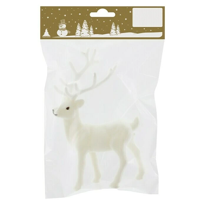 Die Dekofigur in Form eines Hirschs ist der Hingucker in jedem weihnachtlichen Arrangement. Die Figur ist mit weißem Samt beflockt und hat eine Höhe von 17cm.