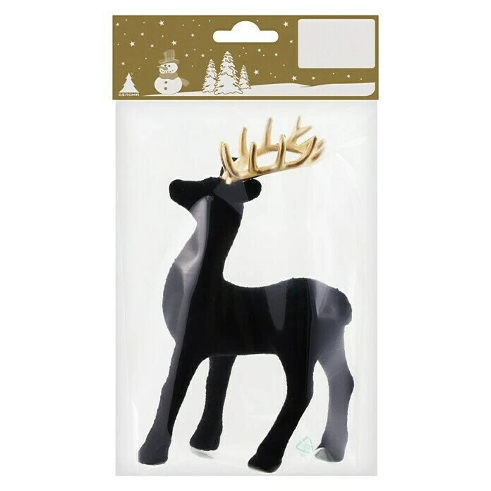 Die Dekofigur in Form eines Hirschs ist der Hingucker in jedem weihnachtlichen Arrangement. Die Figur ist mit schwarzem Samt beflockt und das Geweih ist in gold gehalten.