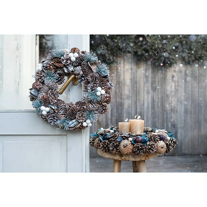 Der Dekokranz „Frost mit Tannenzapfen“ ist der Blickfang in jedem weihnachtlichen Arrangement. Durch seine vielen ausgearbeiteten Details kommt er gut zur Geltung. Die dezente Farbgebung zusammen mit den Tannenzapfen erzeugt eine besonders winterliche Stimmung. Der Kranz kann als Türkranz, Tischdekoration oder aber auch auf Sideboards und Fensterbänken platziert werden.