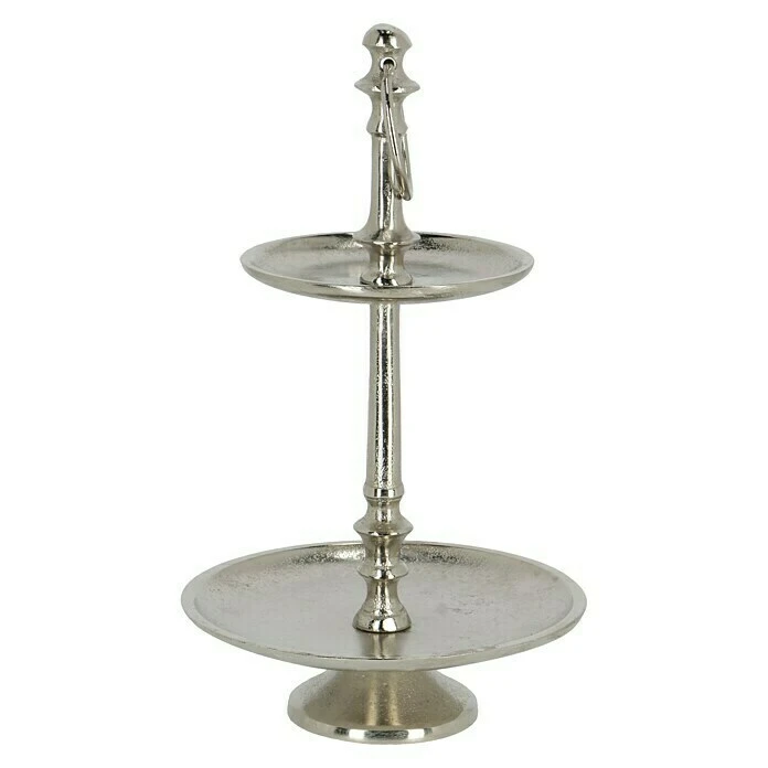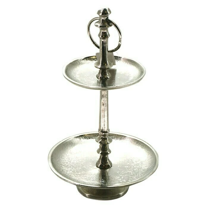 Die Etagere Antik bietet ein elegant-klassisches Wohnaccessoire und eignet sich für verschiedene Verwendungsmöglichkeiten. Auf den beiden Ablageflächen können Süßigkeiten oder kleine Dekoobjekte niedlich und zugleich stilvoll platziert werden. Die silberfarben glänzende Oberfläche in schicker Antik-Optik sorgt für einen echten Hingucker auf dem Tisch oder Sideboard. Diese Etagere passt zu jedem Einrichtungsstil und kann auf viele Arten dekoriert und in Szene gesetzt werden. Dank des runden Griffs am oberen Ende des Stammes ist die Etagere schnell woanders platziert.