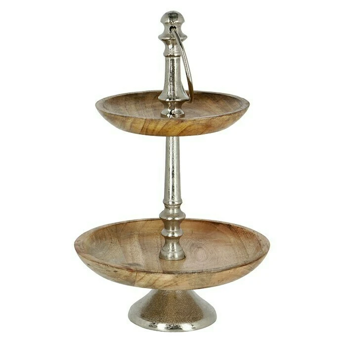 Die Etagere bietet ein elegantes Wohnaccessoire und eignet sich für verschiedene Verwendungsmöglichkeiten. Auf den beiden Ablageflächen können Süßigkeiten oder kleine Dekoobjekte niedlich und zugleich stilvoll platziert werden. Der silberfarbene Metall-Stamm überzeugt durch den Antik-Stil und sorgt zusammen mit den Ablagen aus Mangoholz für einen echten Hingucker auf dem Tisch oder Sideboard. Die klassisch elegante Etagere passt zu jedem Einrichtungsstil und kann auf viele Arten dekoriert und in Szene gesetzt werden. Dank des Ringes am oberen Ende des Stammes ist die Etagere schnell woanders platziert.