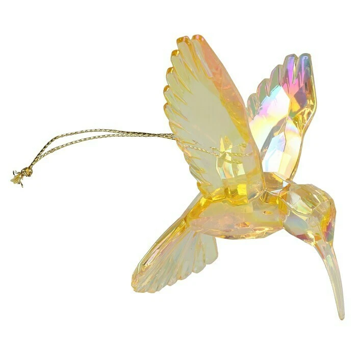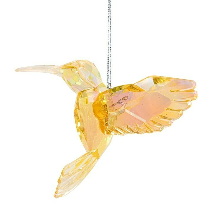 Dieser aus Acryl gefertigte Kolibri ist leuchtend gelb und gold, was ihn zu einer farbenfrohen Ergänzung des Baumes macht. Dieser Vogel hat ein wunderschönes schillerndes Finish, das den Anschein erweckt, als würde der Vogel von Zeit zu Zeit seine Farbe ändern.