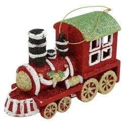 Dieses rot, grün und gold glitzernde Zugornament von Kurt Adler ist eine lustige und festliche Ergänzung für Ihren Weihnachtsbaum. Jeder glitzernde Zug verfügt über Stechpalmenakzente und Schornsteine.